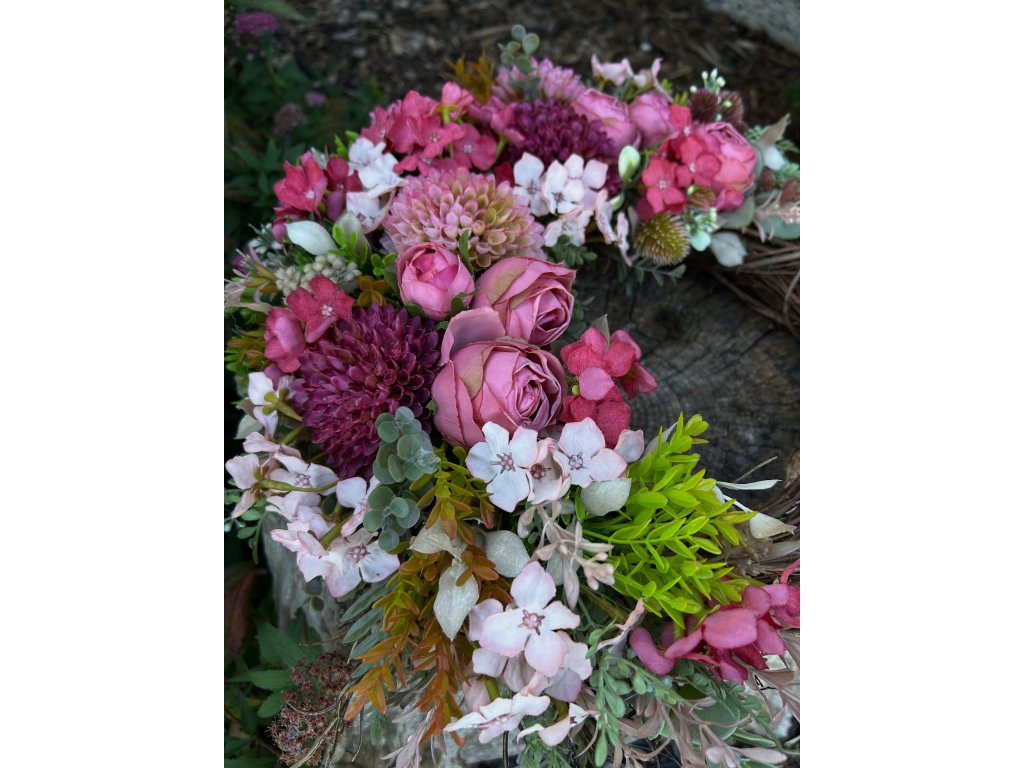 Veliký, hustě zdobený podzimní věnec na dveře. Plný hlavně lásky, hortenzií, růží, dahlie a plno různých okrasných barevných větviček.