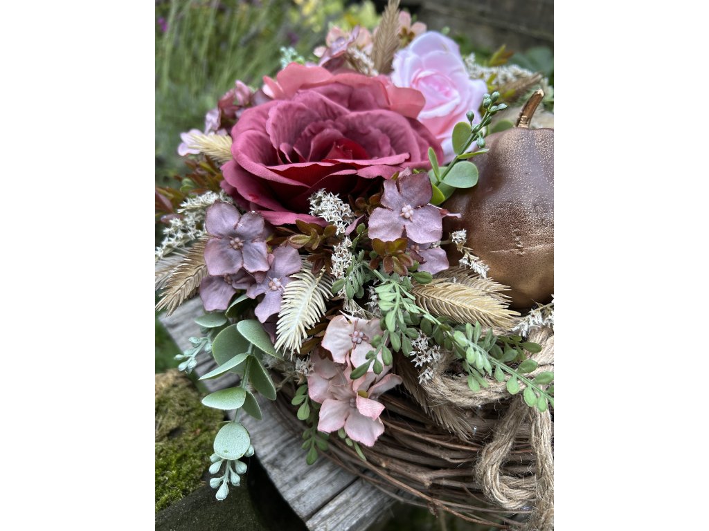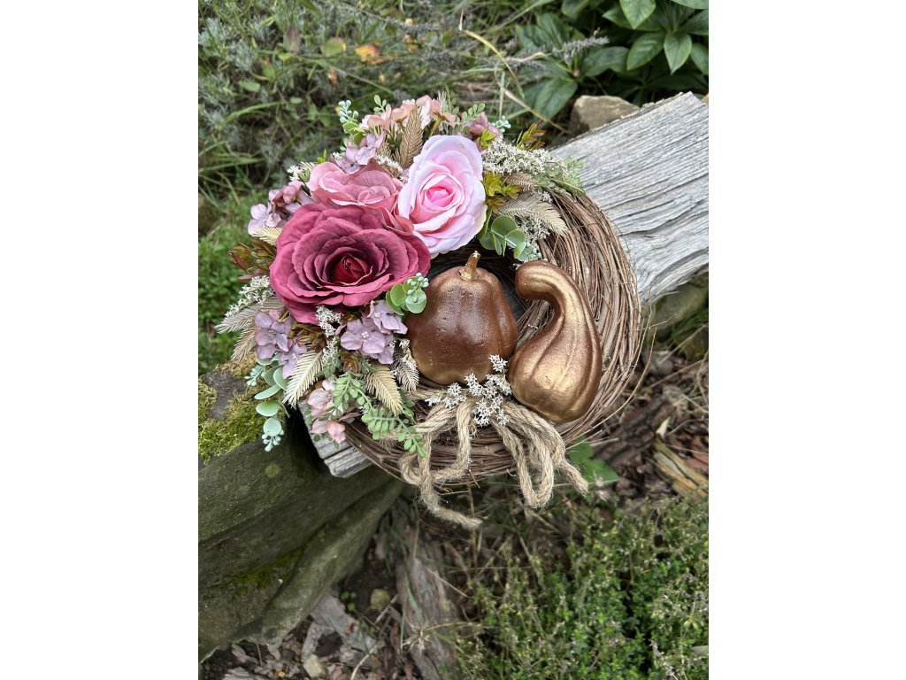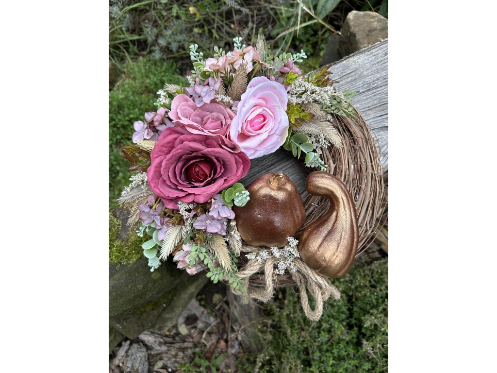 Zajímavý podzimní věnec s růžemi v růžových barvách, se staticí a spoustu drobné zeleně. Přidala jsem na věnec dvě hnědozlaté dýně.